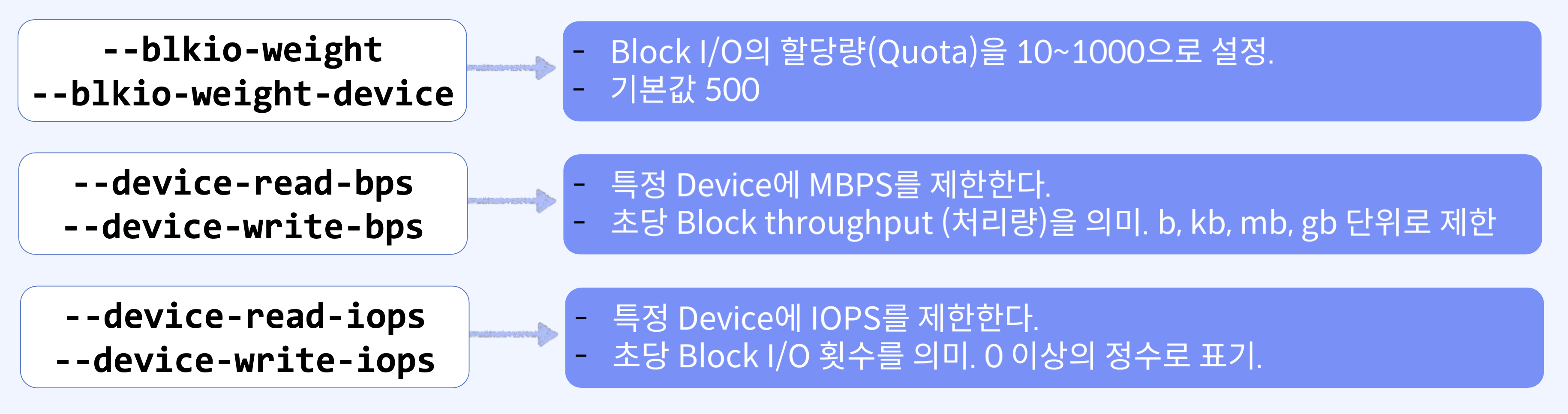 - 컨테이너 I/O 제한을 설정하지 않으면 컨테이너 내부 I/O bandwidth(대역폭)에 제한이 설정되지 않기 때문에 옵션을 통해 Block I/O 제한이 필요하다